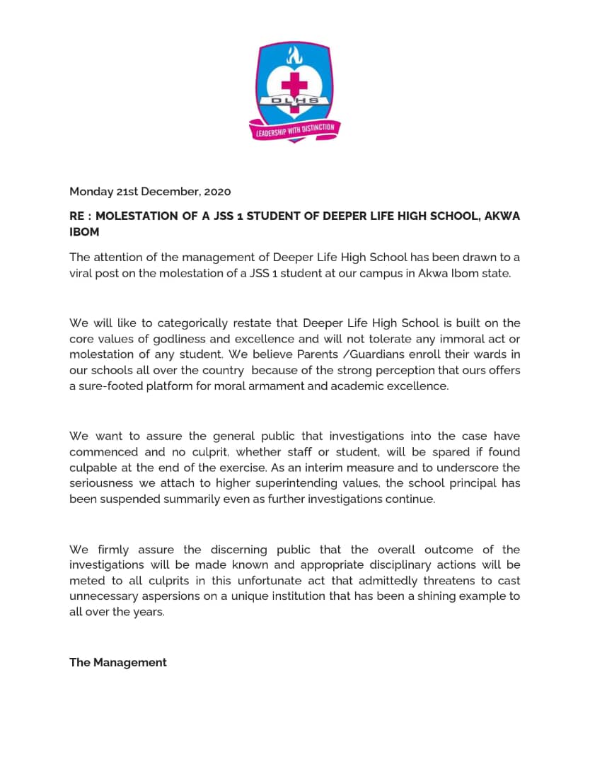 Re:Molestation of a JSS1 student, Don Davis, of Deeper Life High School, Akwa Ibom State. pic.twitter.com/lroxnEd5lt