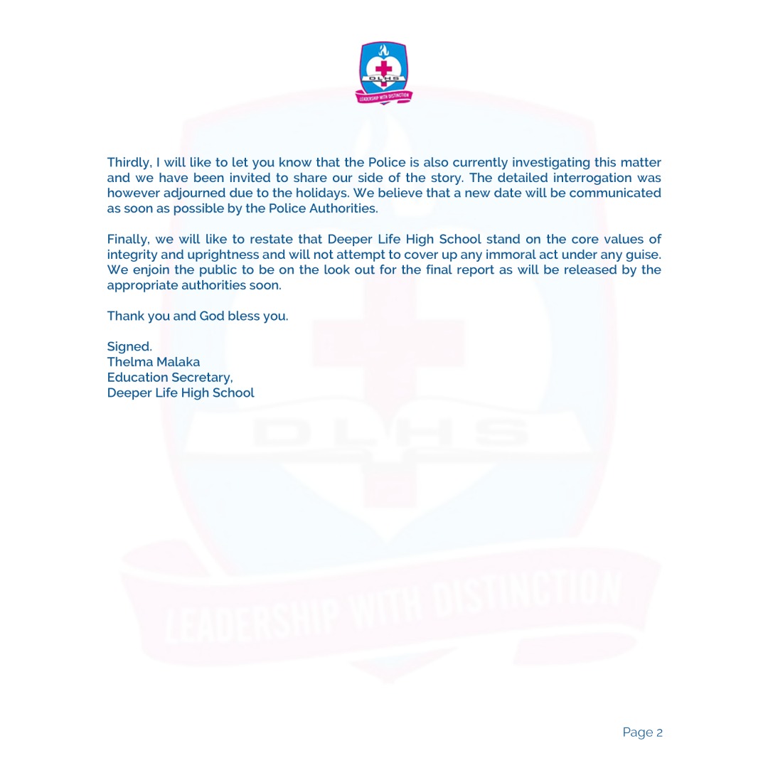 Thankfully, this was, to a large extent, rectified when Thelma Malaka, the Education Secretary of Deeper Life High School made a video reiterating that the church will be transparent and justice will be served.